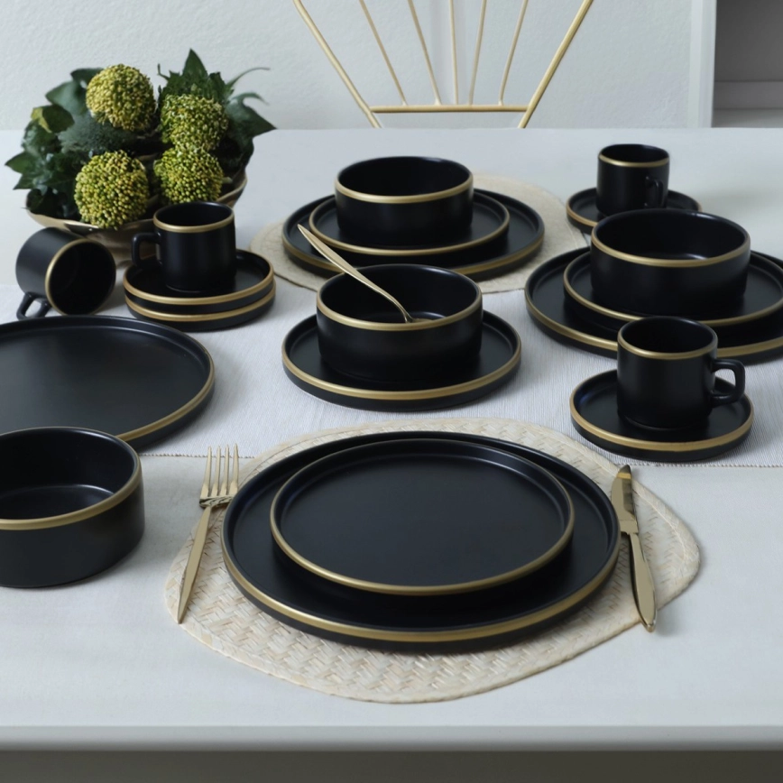 20-osainen keraaminen ruokailusetti, musta/kultainen