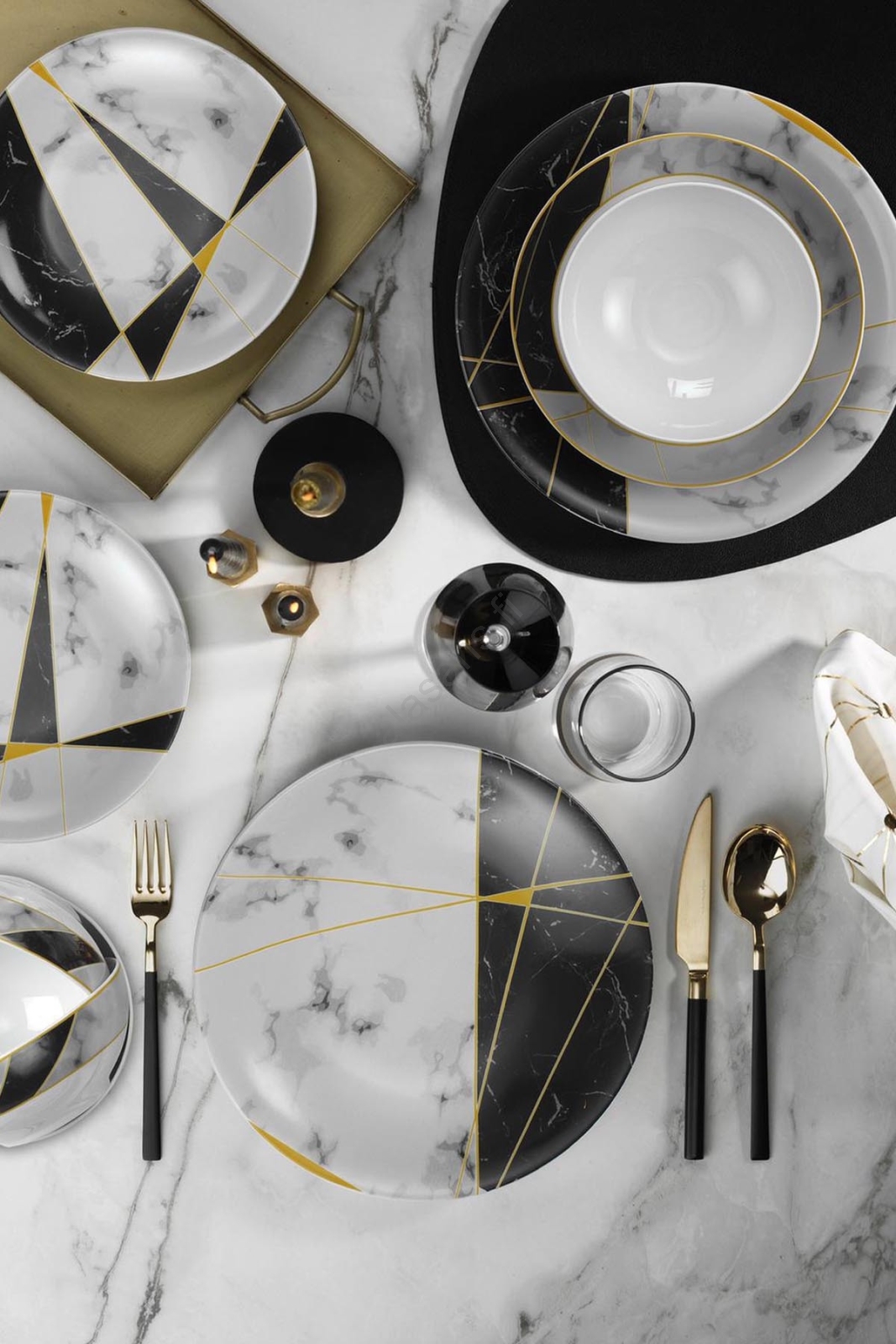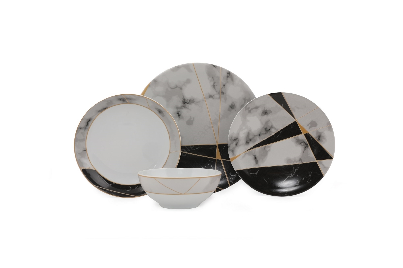 24-osainen astiasto musta/valkoinen/kultainen/posliini