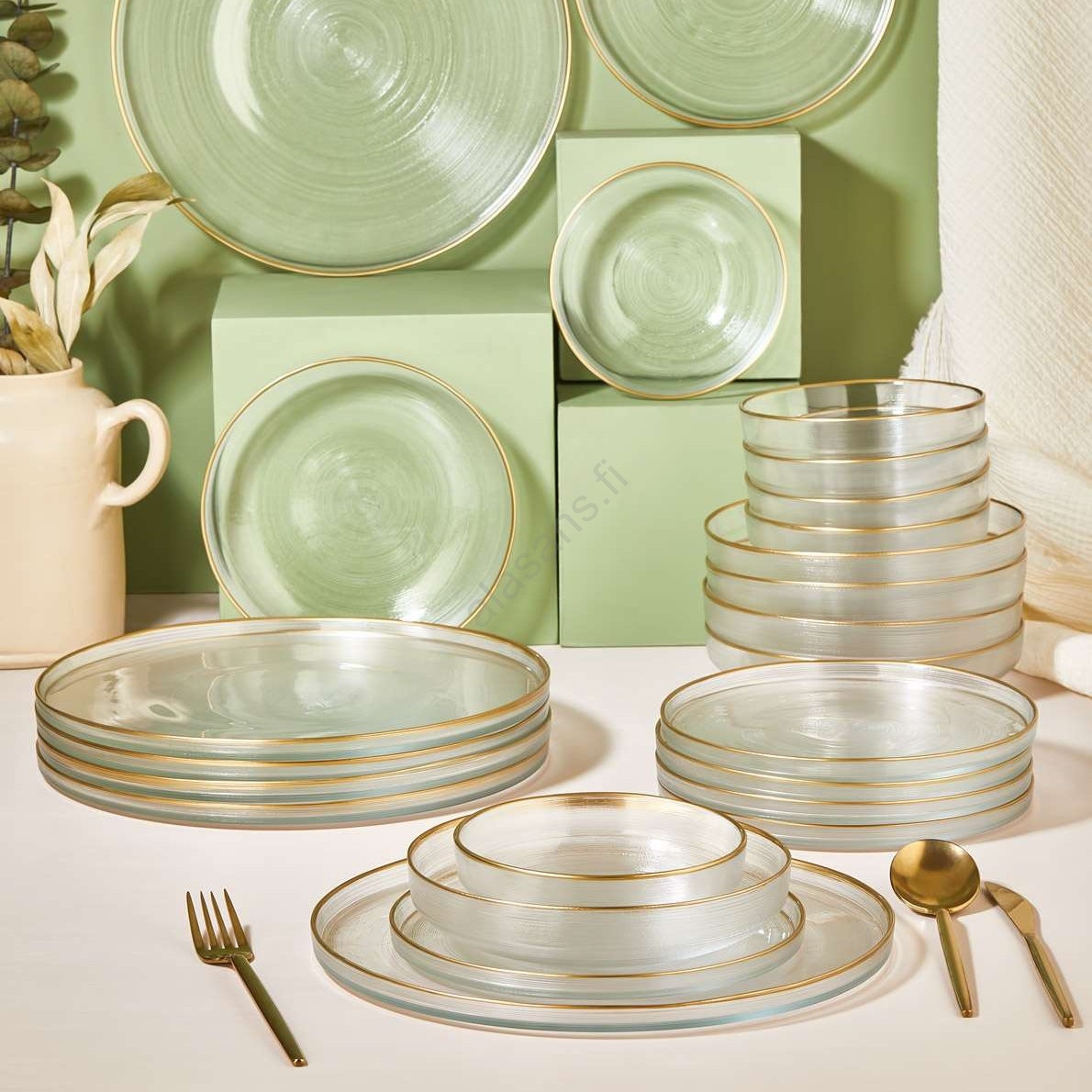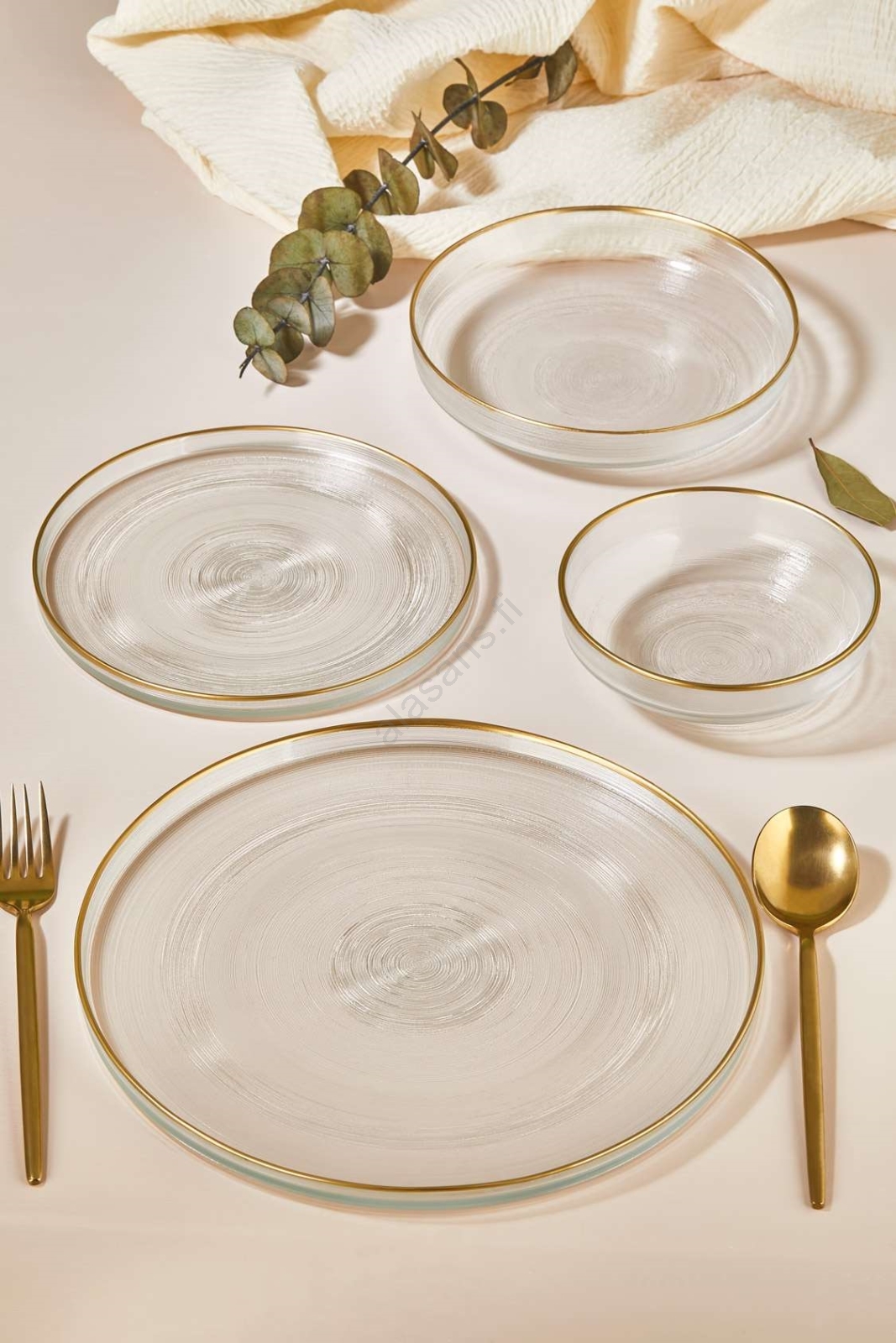 24-osainen ruokailusarja, kirkasta lasia ja kultaisia yksityiskohtia | Alasans