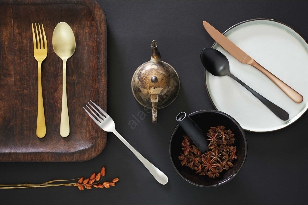 • Ruostumattomasta teräksestä valmistettu ruokailuvälinesetti kullanvärisenä.