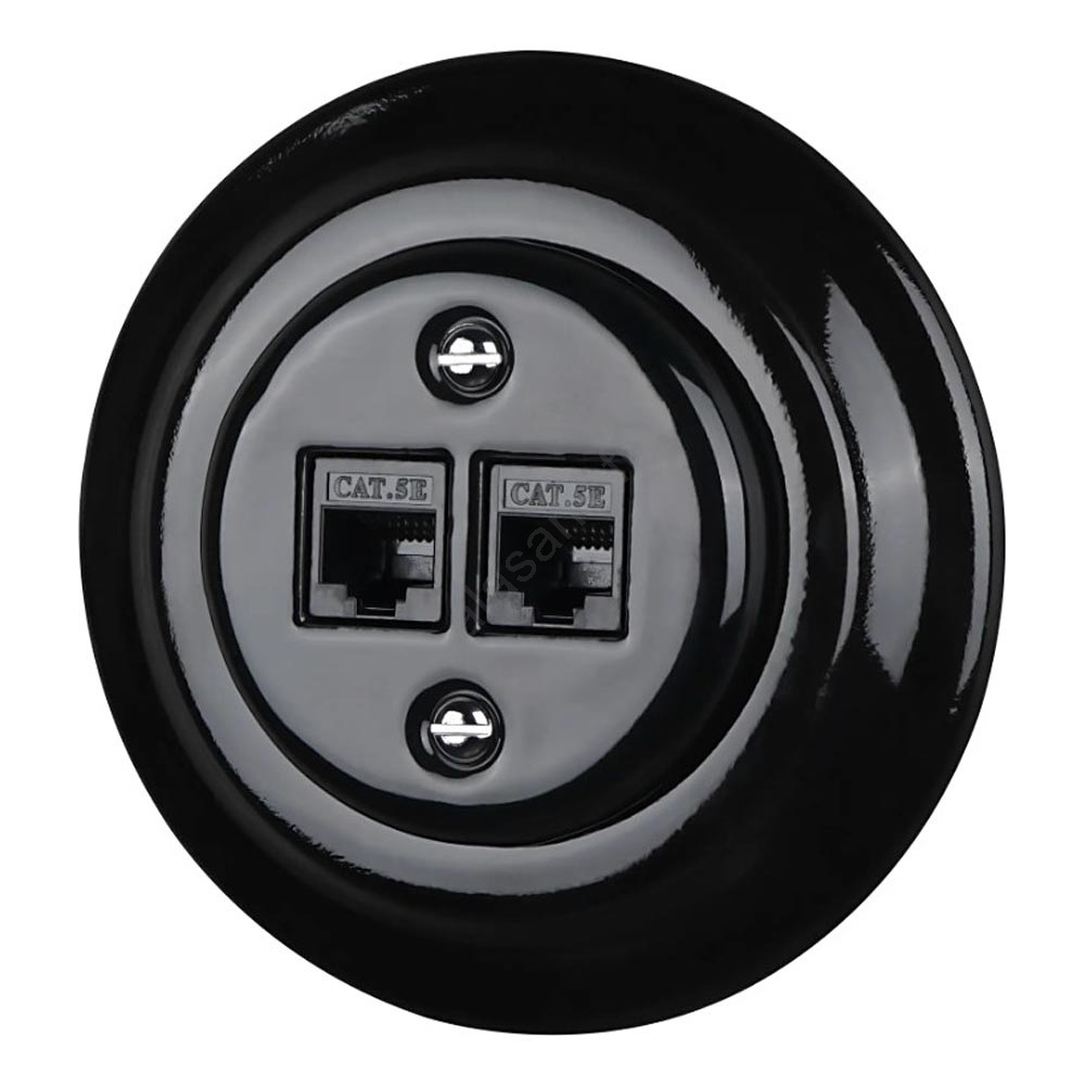 Bohemia-Design - Posliininen retro-tyylinen Ethernet-pistorasia kehyksellä, 2-porttinen CAT5e, musta