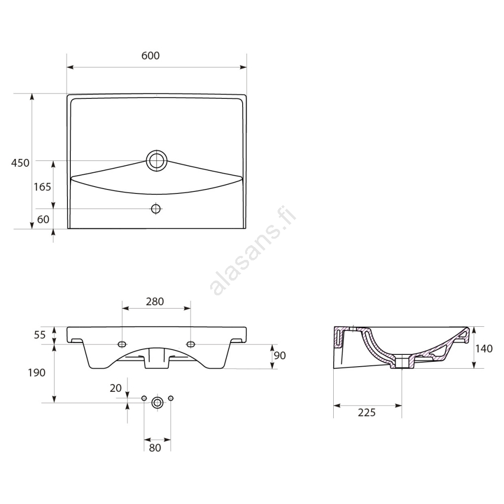 • Keraamisella pesualtaalla on klassinen suorakaiteen muoto, jossa on hana-aukko ja ylivuoto.