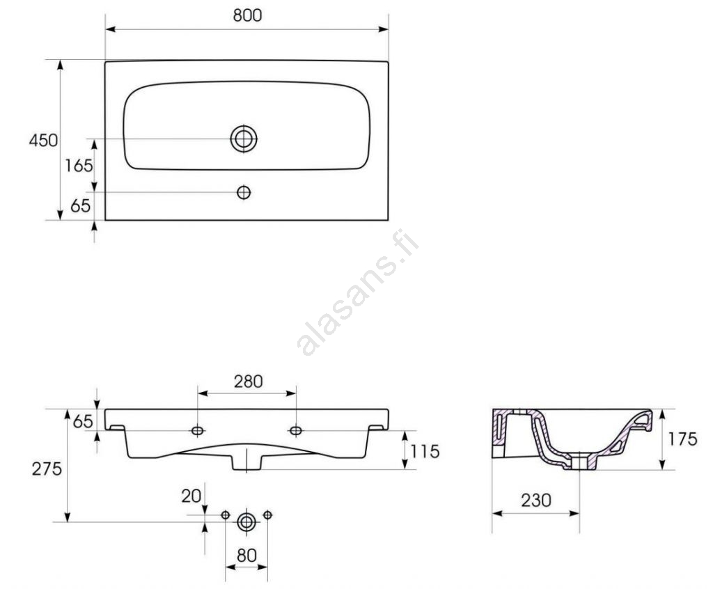 • Keraamisella pesualtaalla on klassinen suorakaiteen muoto, jossa on hana-aukko ja ylivuoto.