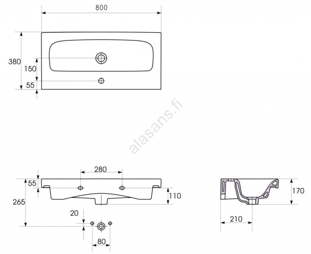 • Keraamisella pesualtaalla on klassinen suorakaiteen muoto, jossa on hana-aukko ja ylivuoto.