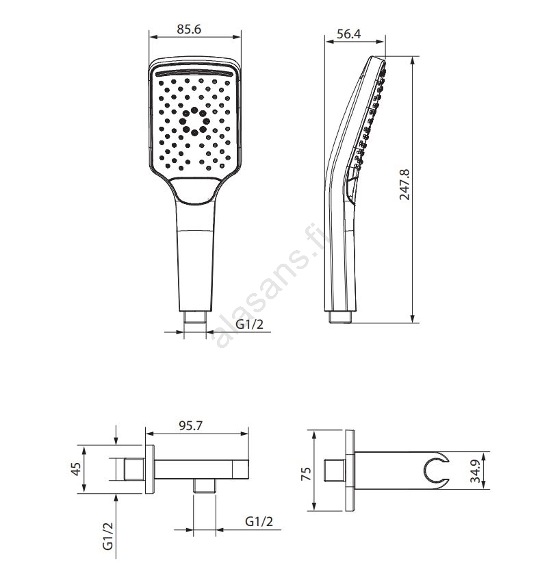 • Käsisuihku, jossa 3 toimintoa.