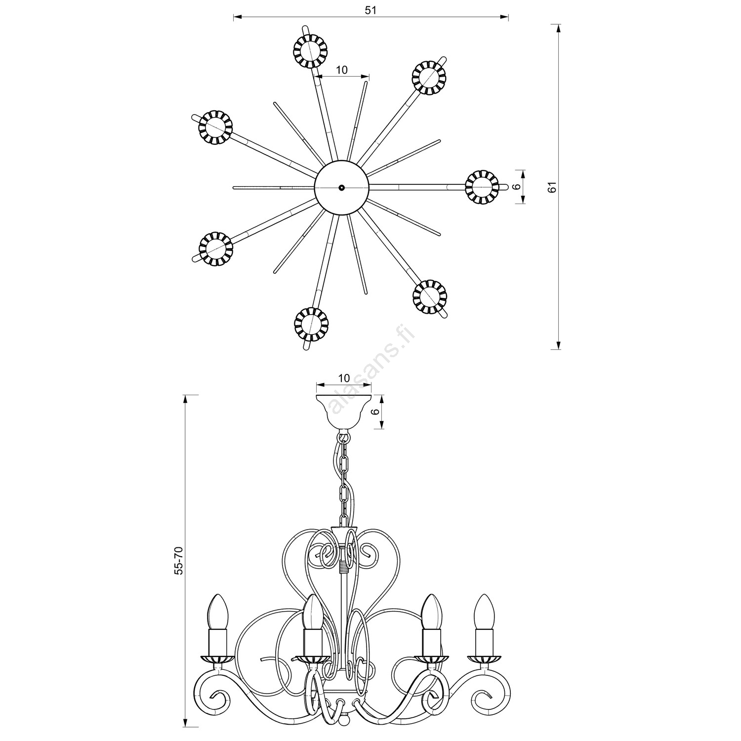 • Ketjulla varustettu kattokruunu, jossa koristeelliset spiraalit.