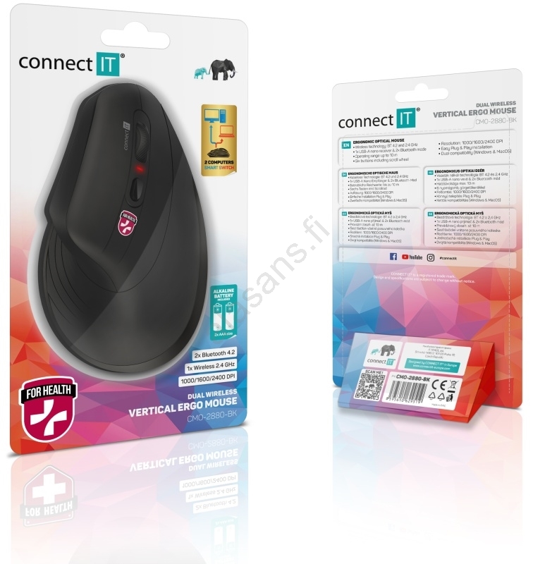 CONNECT IT CMO-2880-BK - Ergonominen langaton hiiri Verti TriMode 1000/1600/2400 DPI 2xAAA | Alasans
