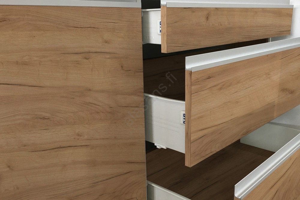 • Yläkaapit on varustettu kaasujousilla, laatikoissa on asennettu laadukkaat koteloidut metalliset liukukiskot.