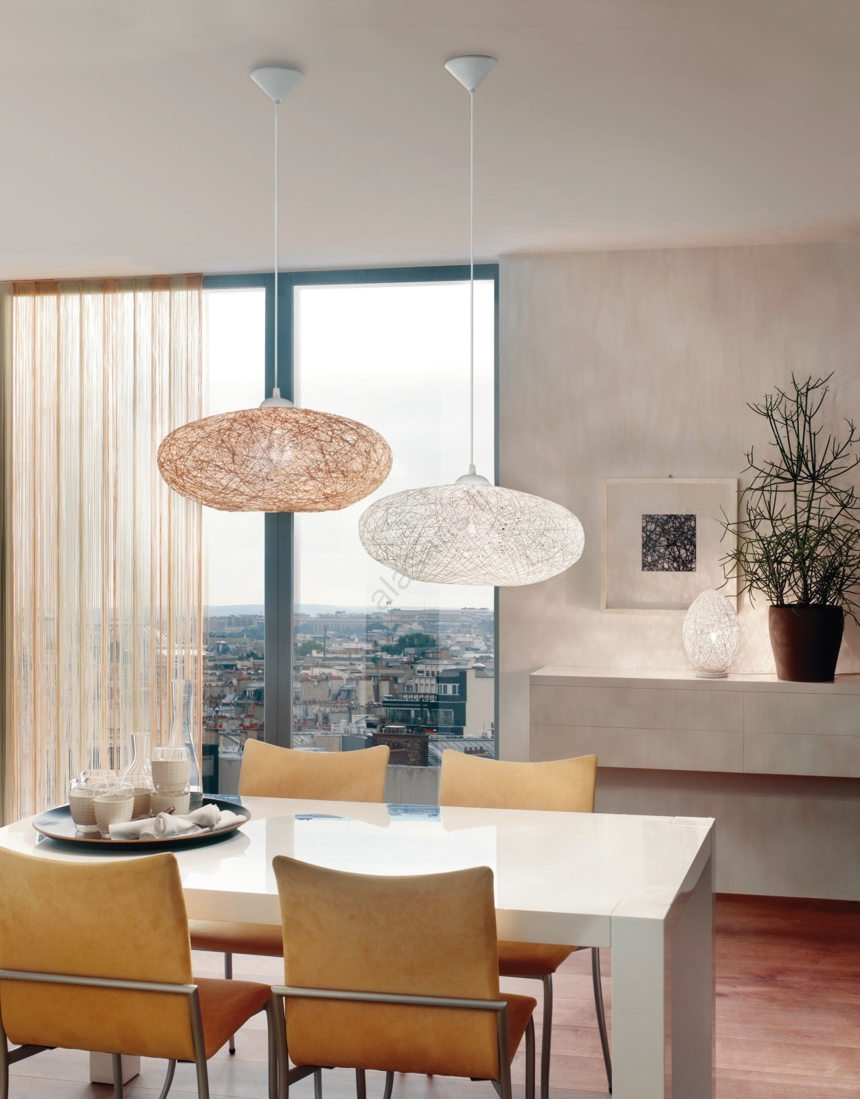 • Moderni kattokruunu, jossa on vaalea luonnonvärinen varjostin tekstiilinaruista.