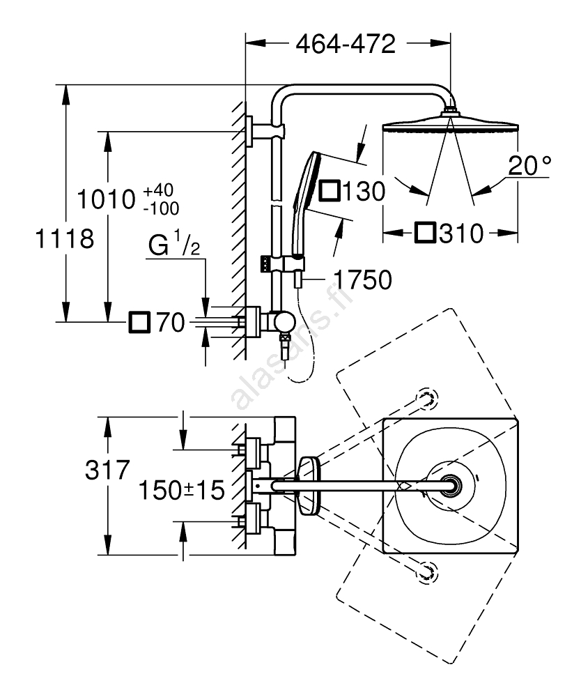 • Seinäasenteinen termostaattihana Aquadimmer-toiminnolla, joka mahdollistaa helpon vaihtamisen pää- ja käsisuihkun välillä.