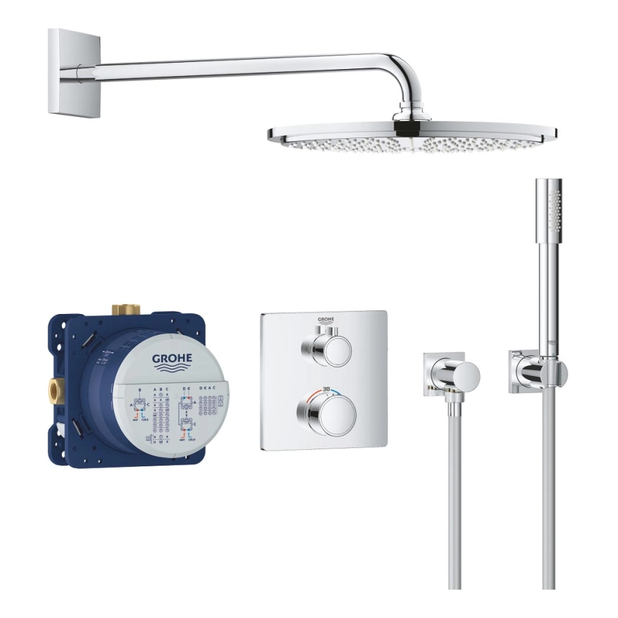 • Sisältää Grohtherm-termostaattisen sisäänasennettavan hanan Aquadimmerilla, joka mahdollistaa helpon vaihtamisen ylä- ja käsisuihkun välillä.
