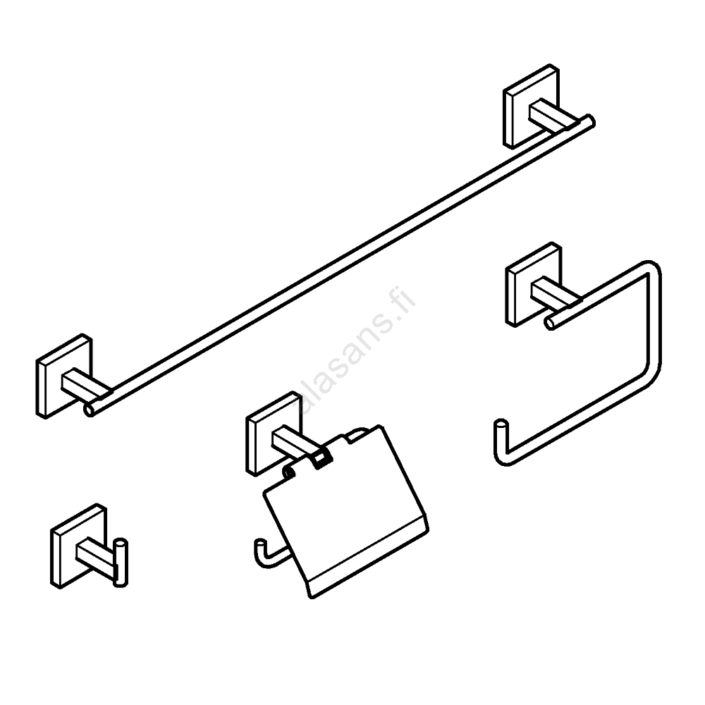 • Sarja sisältää kylpytakkikoukun, pyyherenkaan, wc-paperitelineen ja 558 mm pitkän pyyhetangon.