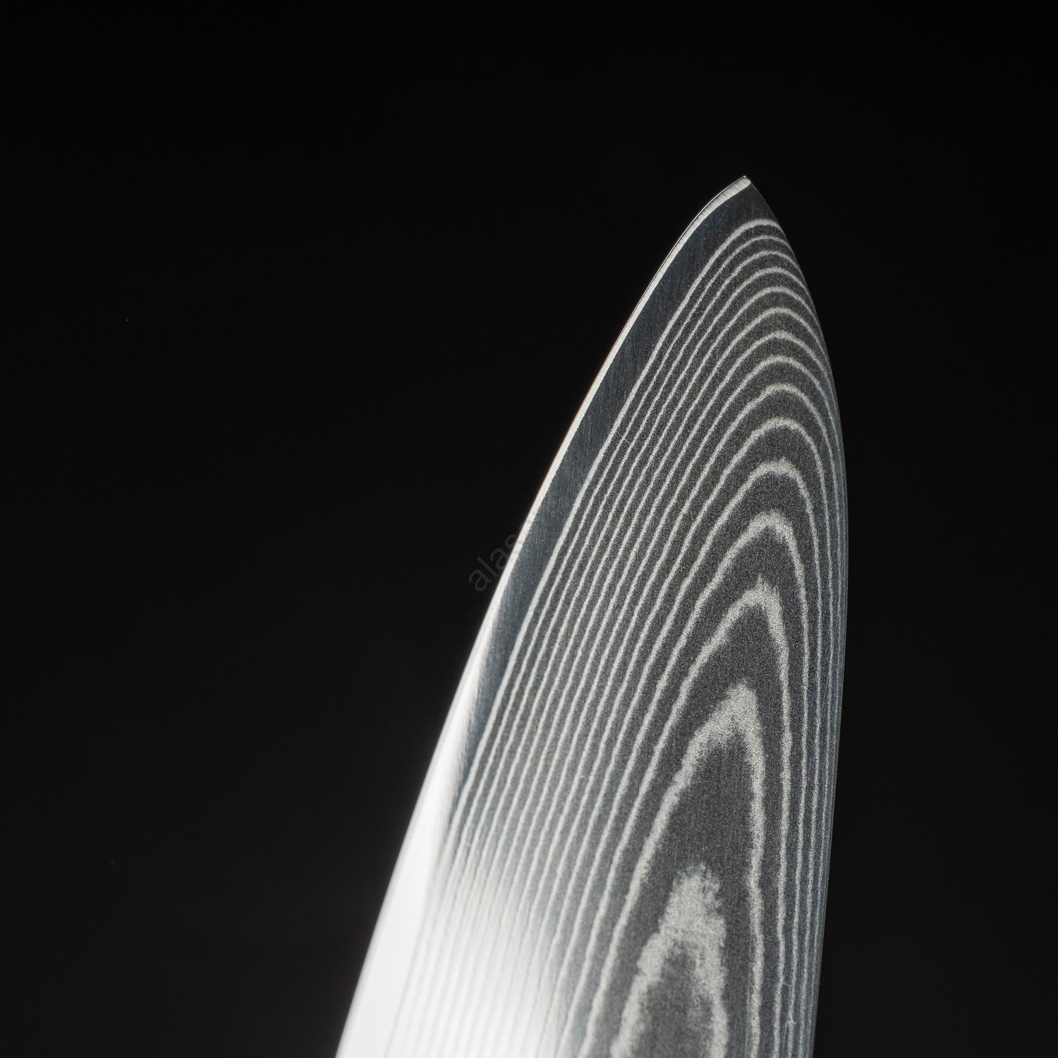 • Terä, pituus 200 mm , on valmistettu 67 kerroksesta damaskiterästä ja sen ytimenä on VG10 – premium-tason japanilainen teräs, joka tunnetaan poikkeuksellisesta kovuudestaan, kestävyydestään ja pitkäkestoisesta leikkausterävyydestään.