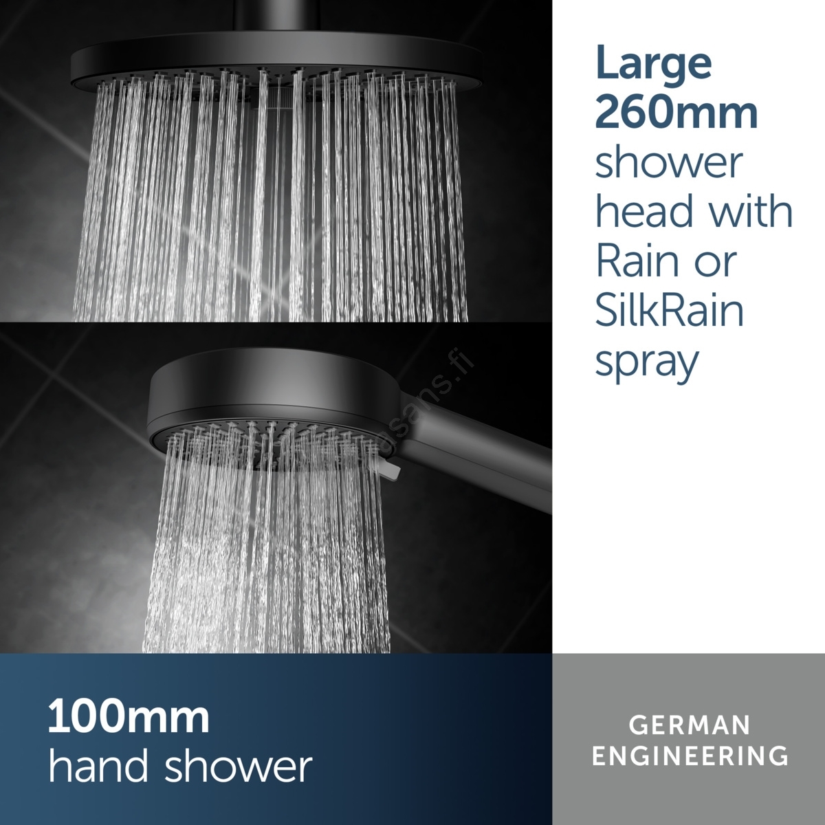 • Yläsuihku, halkaisija 260 mm, tarjoaa kaksi suihkutoimintoa (SilkRain ja Rain), joita vaihdetaan keskikytkimellä.