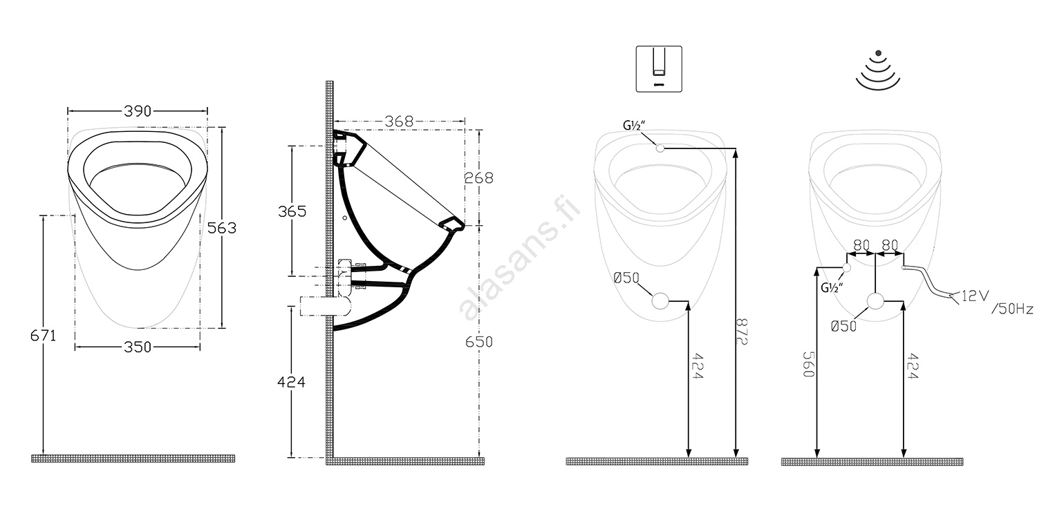 • Urinaalissa on piilotettu kiinnitys ja vesiliitäntä ½".