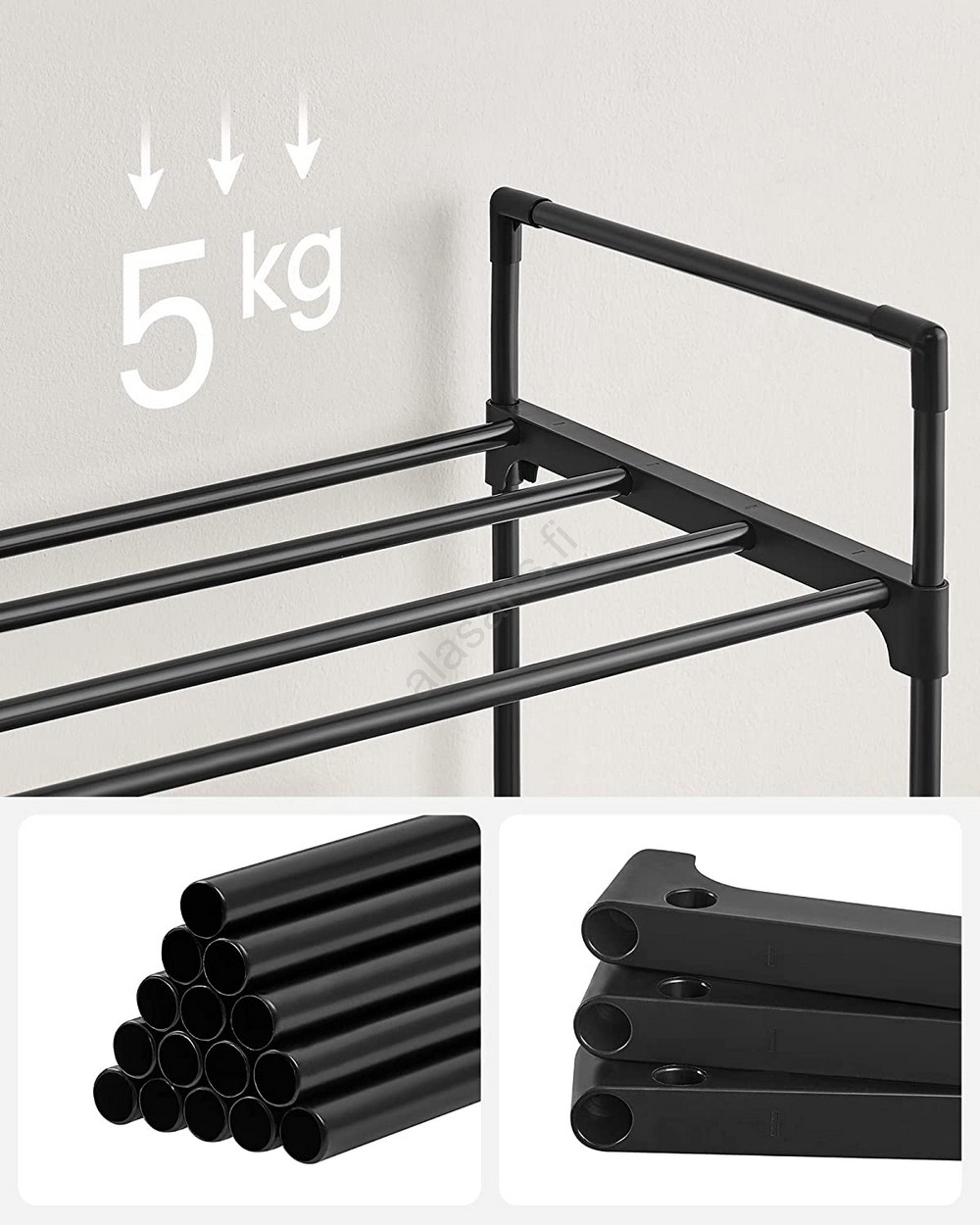 • Kapean muotonsa ansiosta tämä kolmitasoinen kenkähylly vie vähän lattiatilaa mutta tarjoaa silti riittävästi säilytystilaa 12 paria kenkiä.