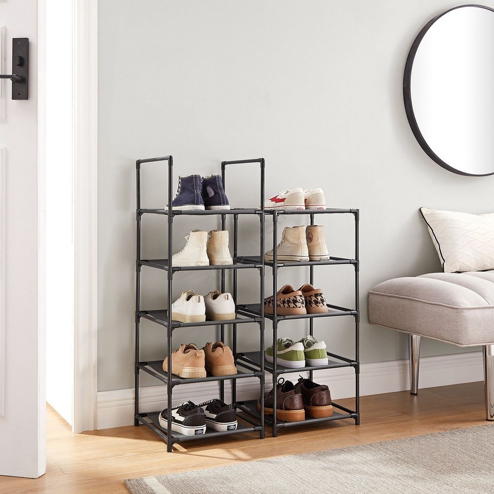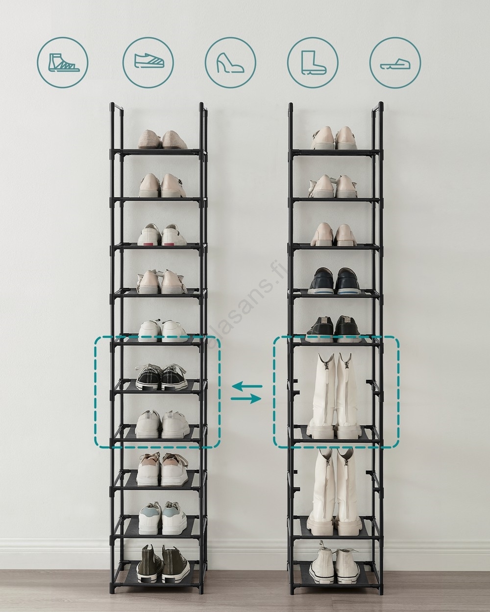 • Kapean muotonsa ansiosta tämä 10-tasoinen kenkäkaappi vie vähän lattiapinta-alaa mutta tarjoaa silti runsaasti säilytystilaa.