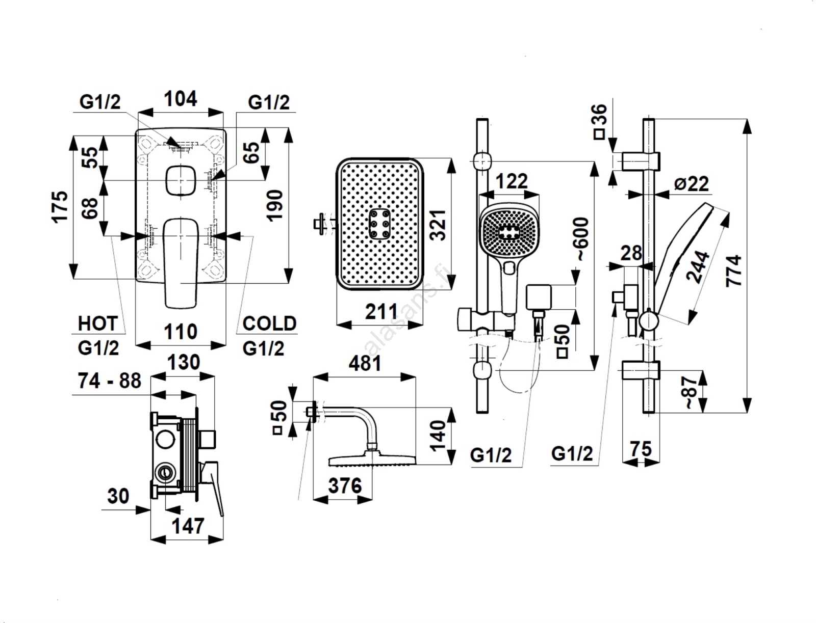 • Pakkaus sisältää: uppoasennuskotelo, täydellinen suihkuhana, suihkuvarsi, suihkulevy letkulla, piilotettu liukuva käsisuihku.