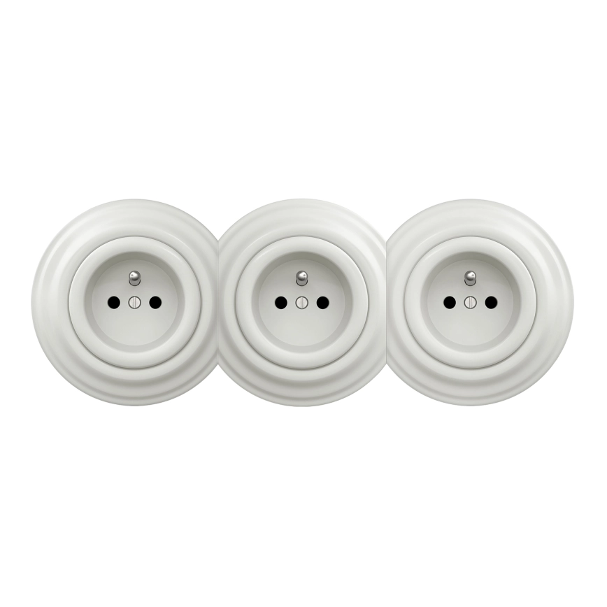 Kliklap - Kolmipaikkainen retrotyylinen seinäpistorasia kehyksellä, 230 V, valkoinen