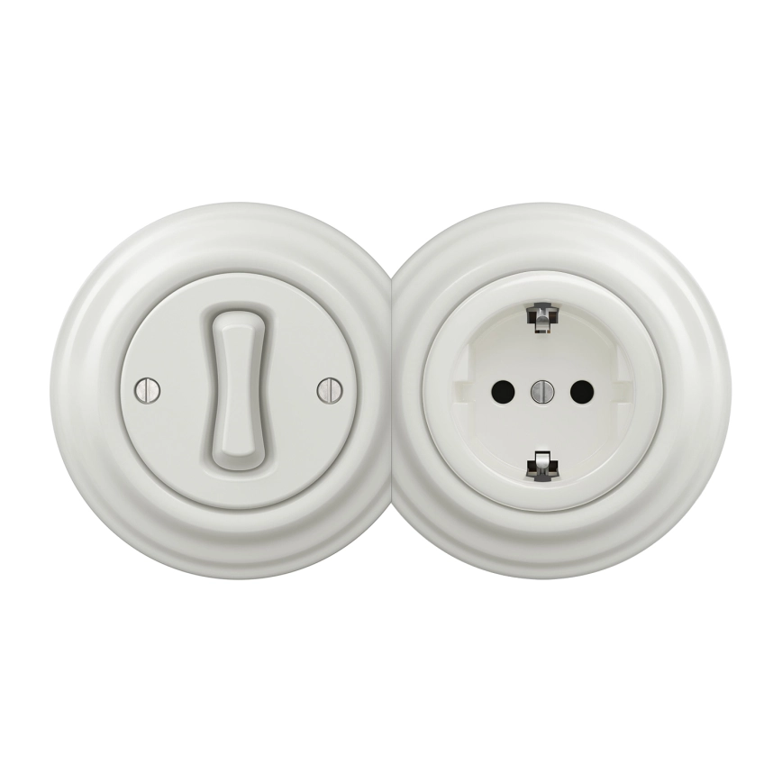 Kliklap - Retro yksinapainen kytkin nro 1 ja SCHUKO 230V-pistorasia kehyksellä, valkoinen | Alasans