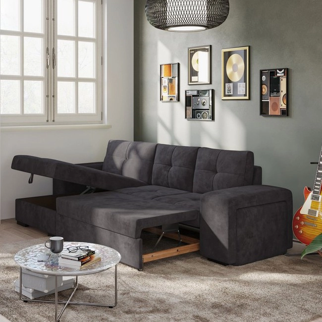 • Modernin tikkauksen ja harkitun muotoilun ansiosta tämä kulmasohva sopii erinomaisesti pienempiin tiloihin, mutta tarjoaa silti suuren nukkumatilan ja riittävästi säilytystilaa.