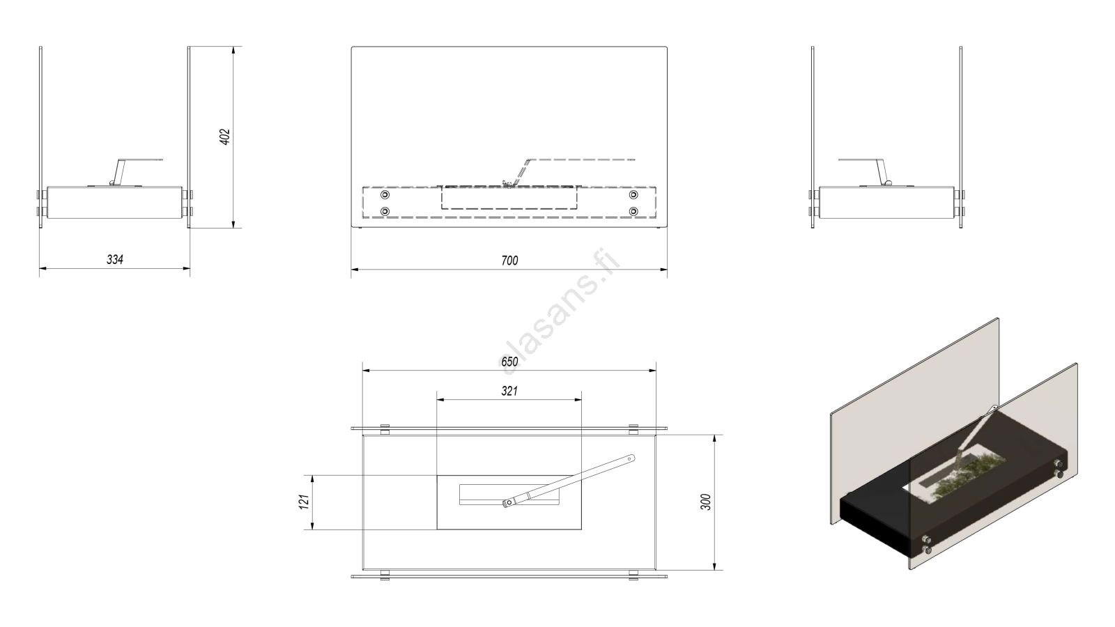 • Suojaava lasi peittää liekin kahdelta sivulta.