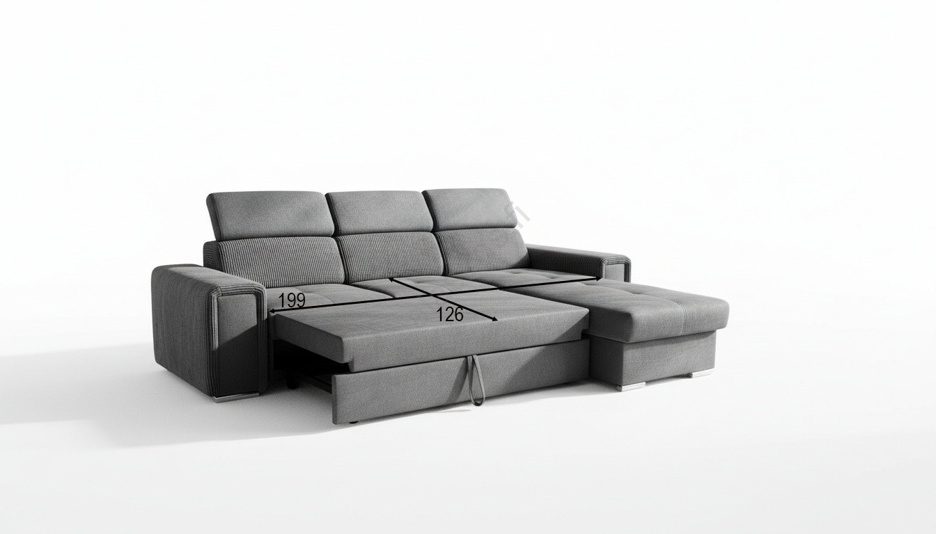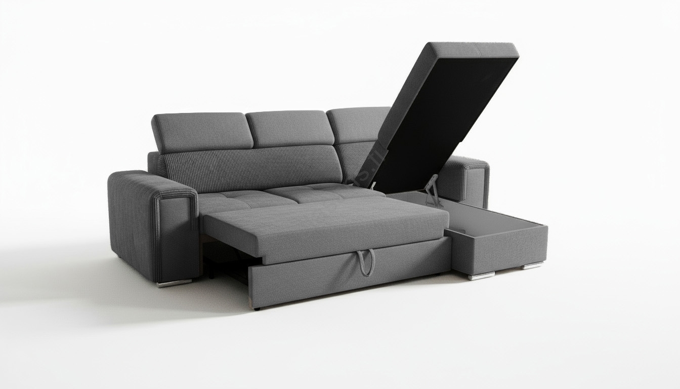 Käännettävä L-mallinen kulmasohva SALVADA, vuoteeksi avattava ja säilytystilalla, tummanharmaa | Ala