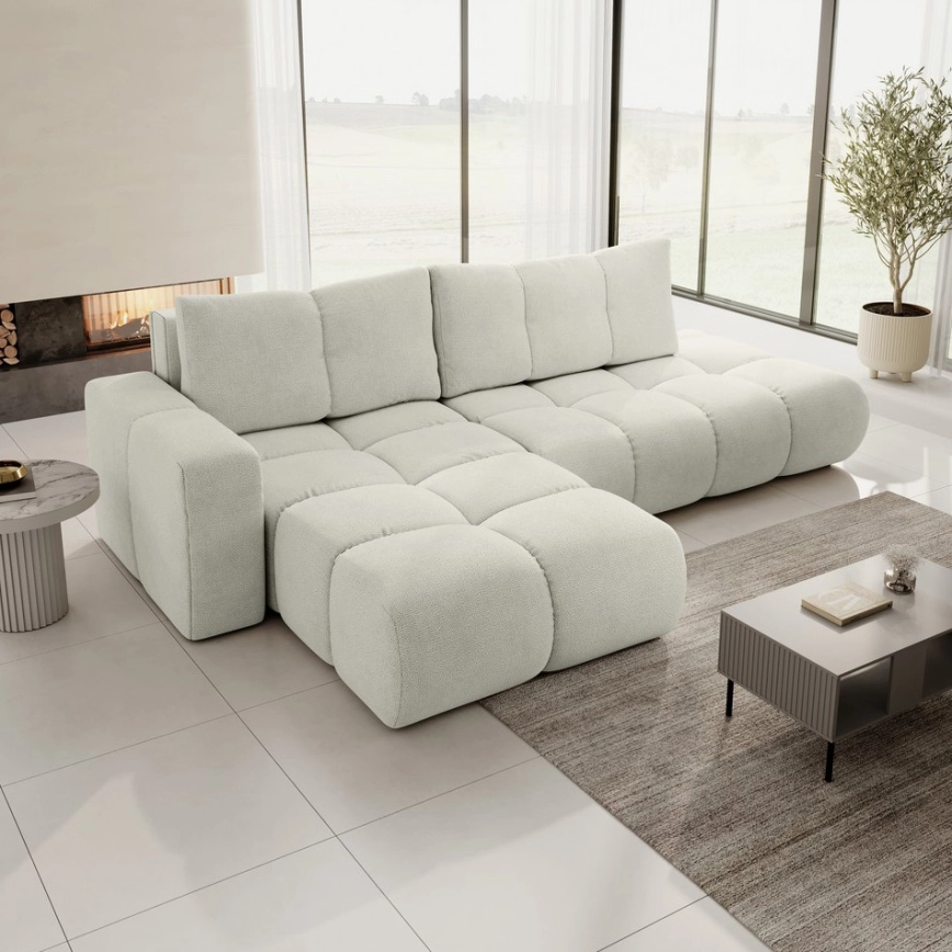 ALMADA L-muotoinen verhoiltu kulmasohva, levitettävä vuoteeksi, säilytystilalla, vasen, beige | Alas