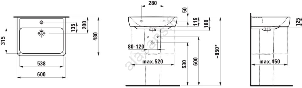 LAUFEN H8189520001041 - Altaan asennus tasolle/seinäkiinnitteinen PRO 60x48 cm keramiikka/valkoinen