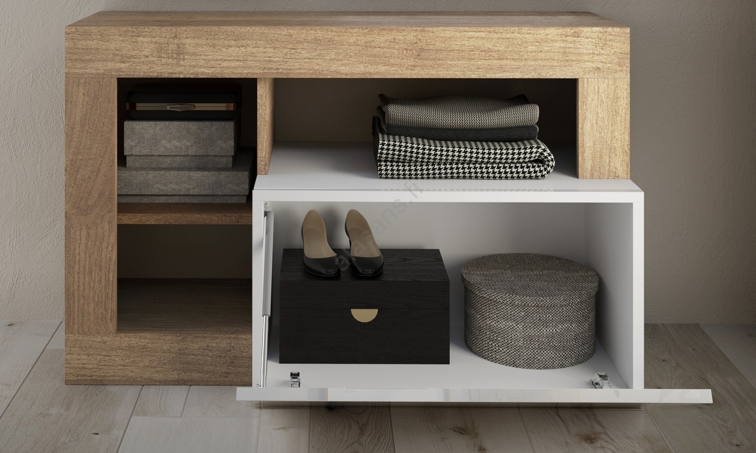 • Siinä on 3 avointa hyllyä sekä sisäinen kippihylly laukkujen, kenkien ja kausitavaroiden säilytykseen.