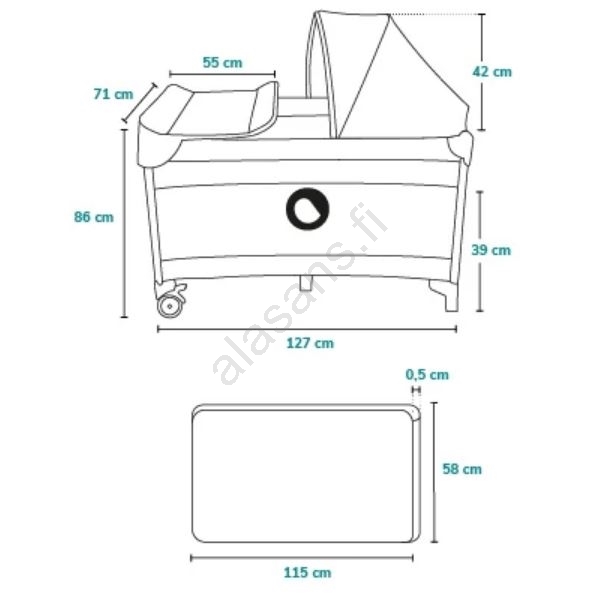• Pakkaukseen sisältyy: hoitopöytä sivutaskuilla (vaippoja, talkkia ym. varten), tarvikekori kahdella lokeroilla, suuri hyttysverkko, katos ja leikkikaari pehmeine leluineen.