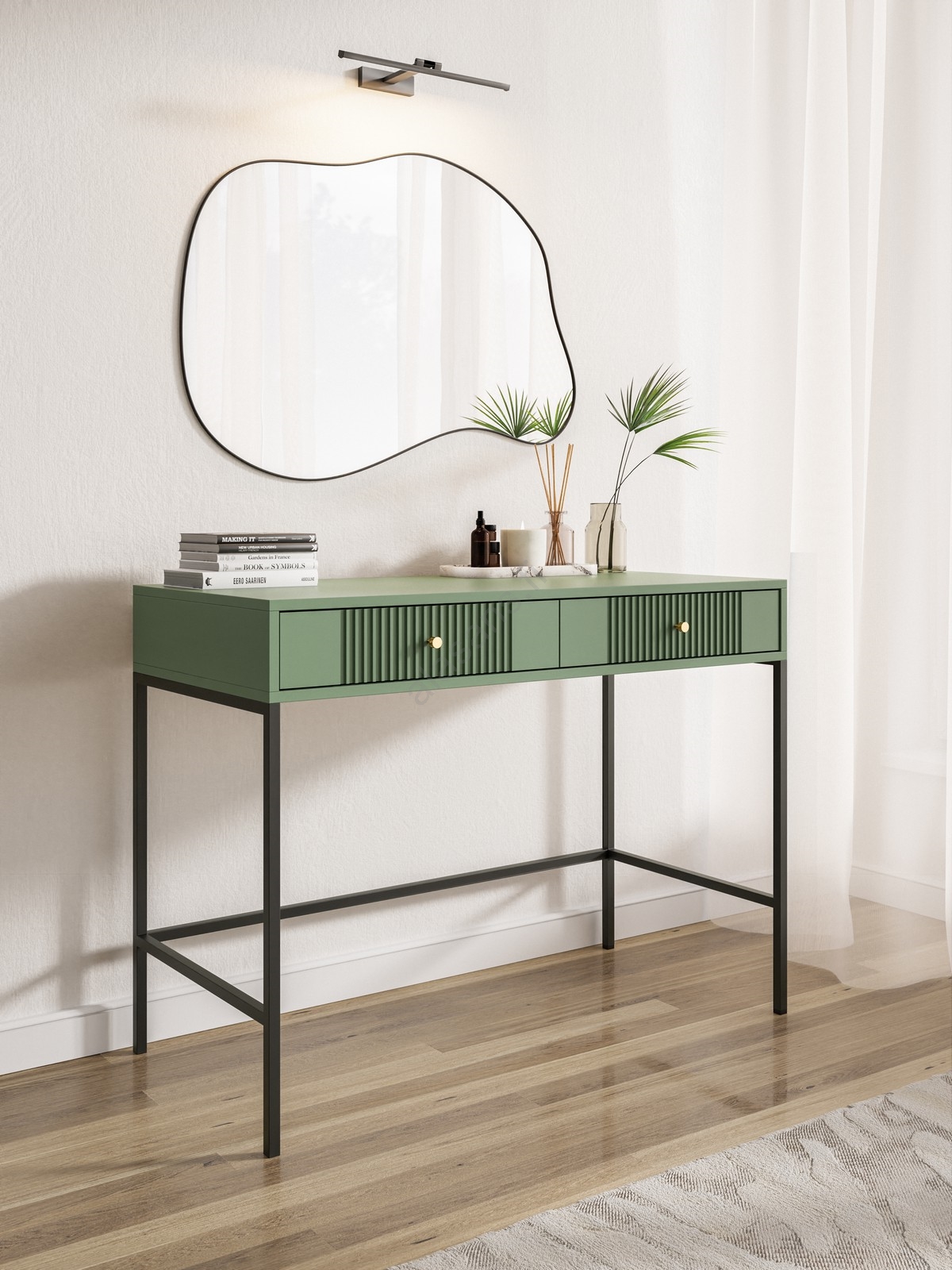 • Siinä on kaksi vetolaatikkoa, jotka on koristeltu pystysuuntaisilla uurteilla ja jotka luovat hienostuneen visuaalisen ilmeen.