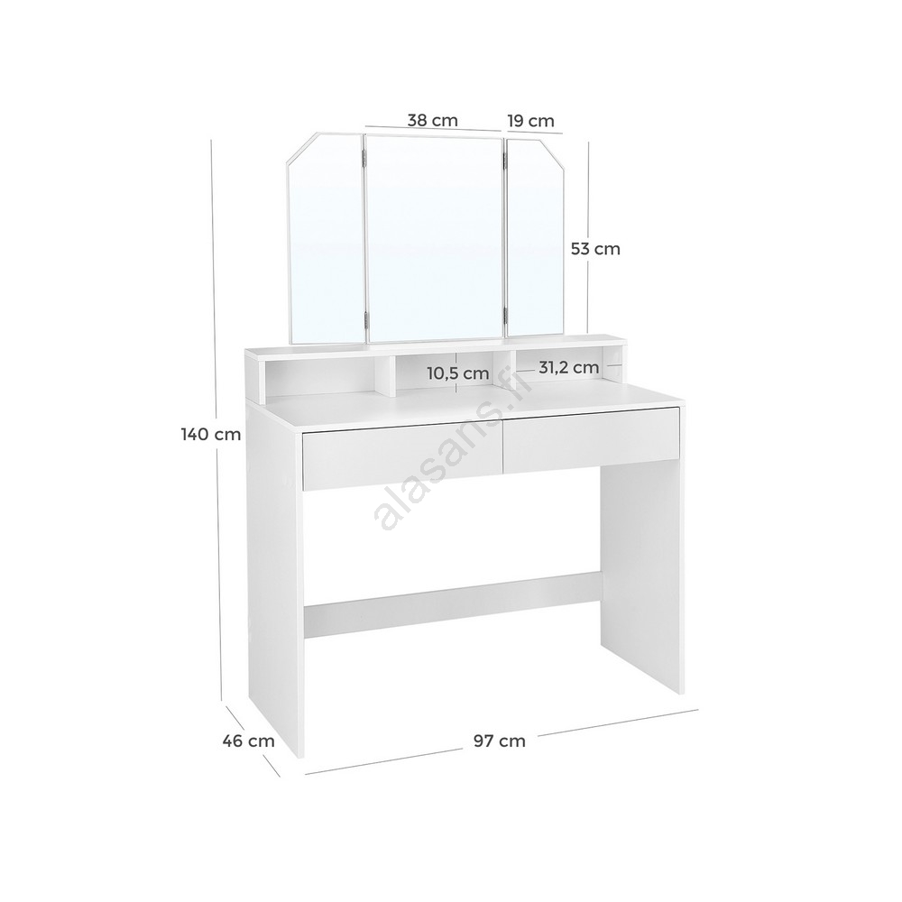 • 2 laatikkoa ja niiden yläpuolella oleva hylly pitävät kosmetiikkasi ja meikkisi helposti saatavilla.