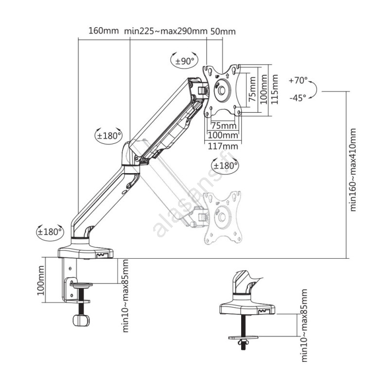 • Korkeuden säätö on erittäin helppoa kaasujousen ansiosta. Jousen voimaa voidaan säätää tarpeen ja TV:n tai näytön painon mukaan, ja sen 100% toiminta on taattu kuormilla 2 - 9 kg.