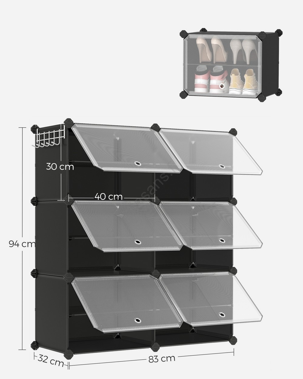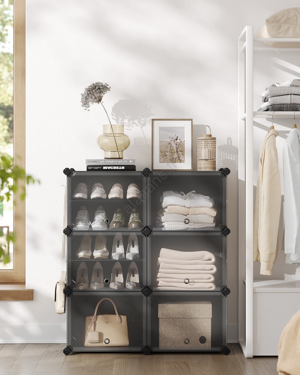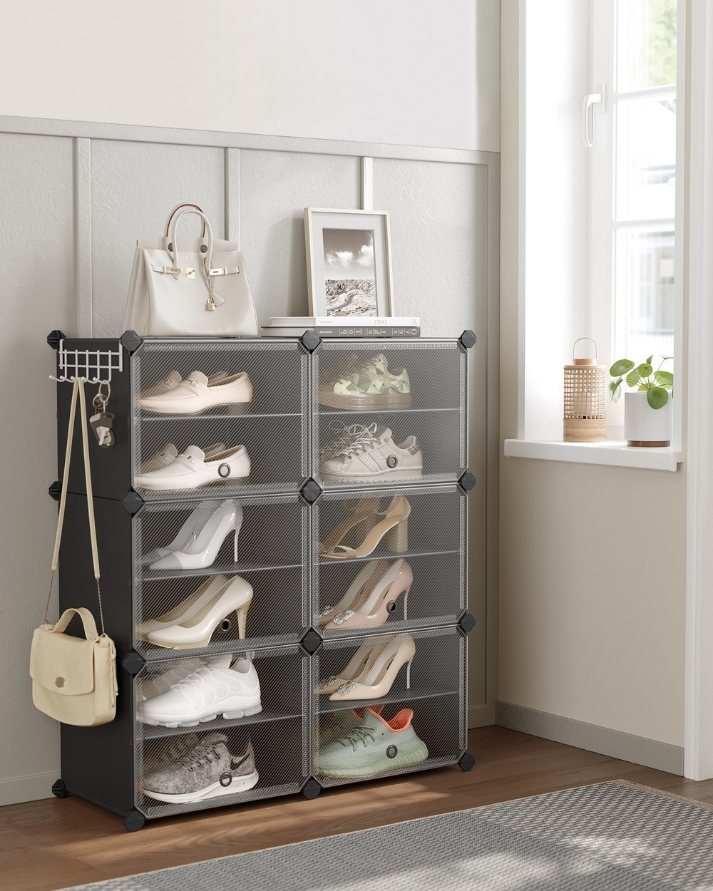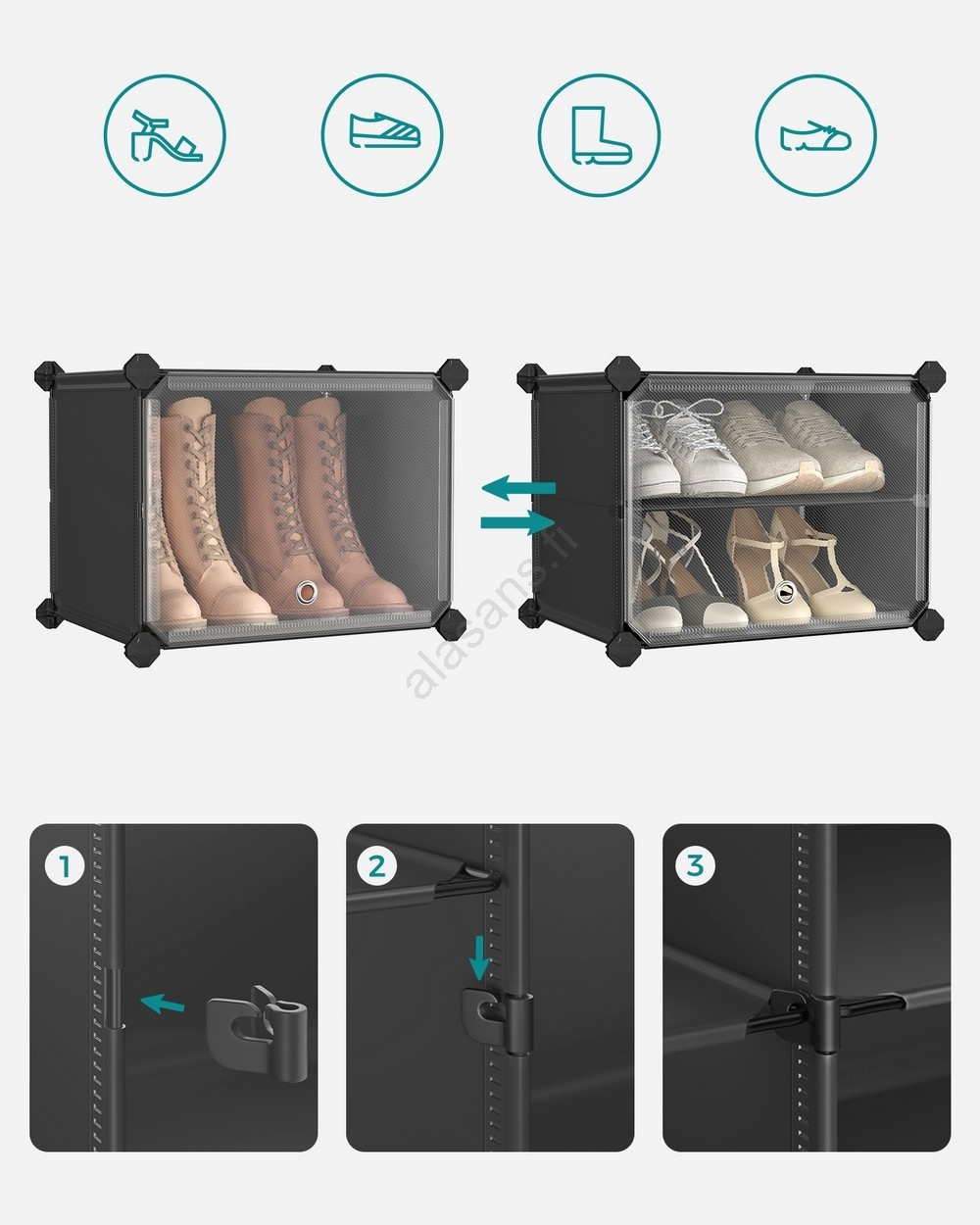 • Tämän kenkäkaapin jokainen lokero on valmistettu korkealaatuisista liitososista, muovipaneeleista ja vankasta teräslangasta, ja se kantaa jopa 5 kg.