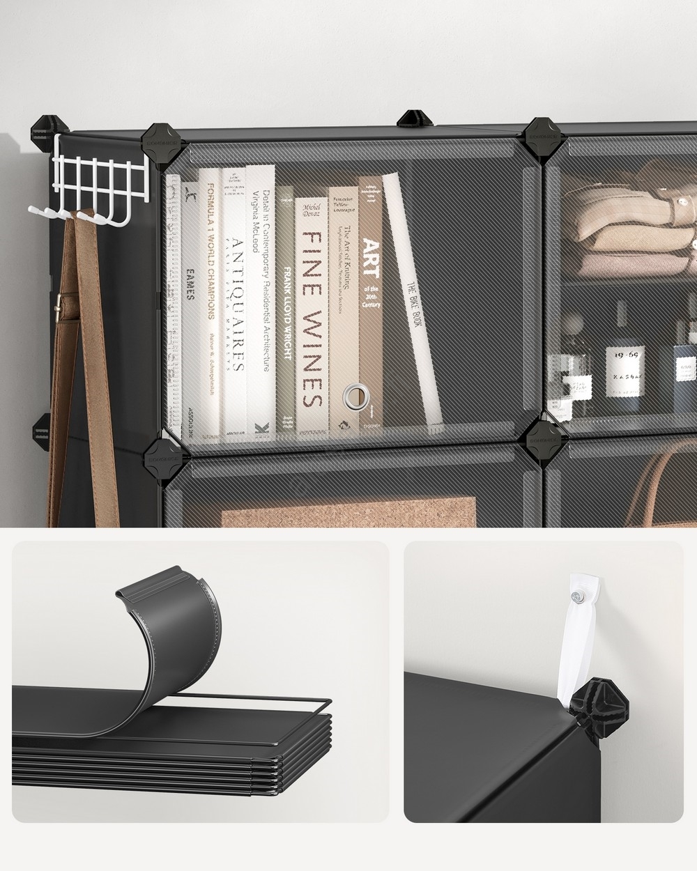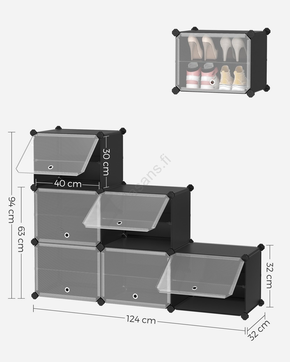 • Säilytin vetää jopa 24 paria kenkiä, ja sitä voi käyttää myös laukkujen ja vaatteiden säilytykseen.