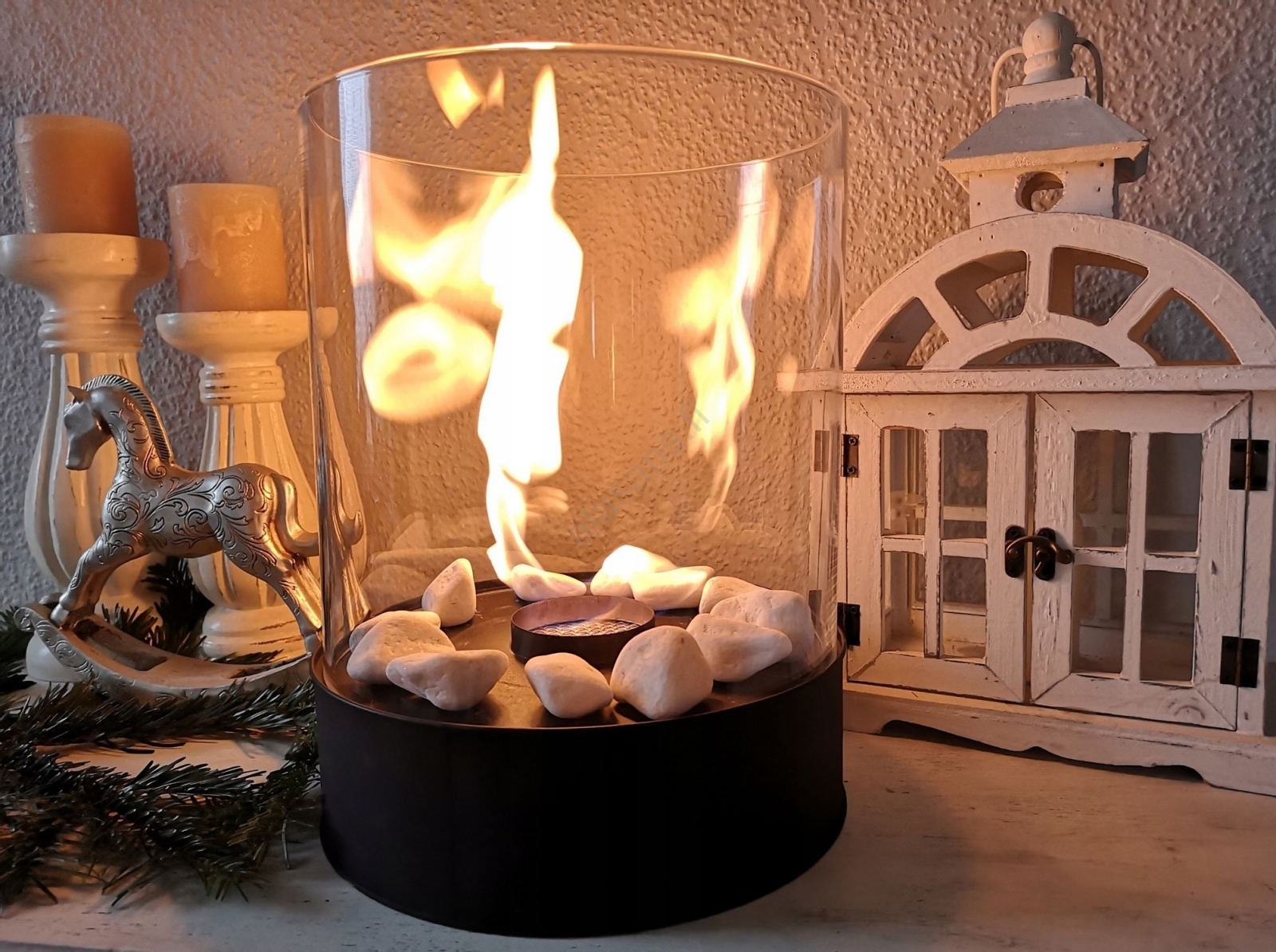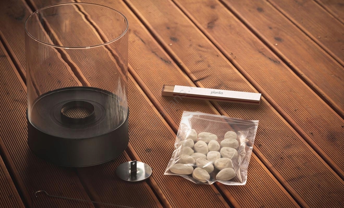 • Takka, suojalasi, tulitikut, liekin sammuttamiseen tarkoitettu työkalu, koristekivet.