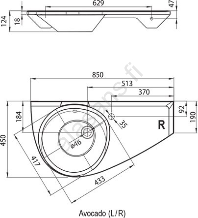 • Altaassa on ylivuoto ja 35 mm:n halkaisijaltaan oleva reikä hanaa varten.