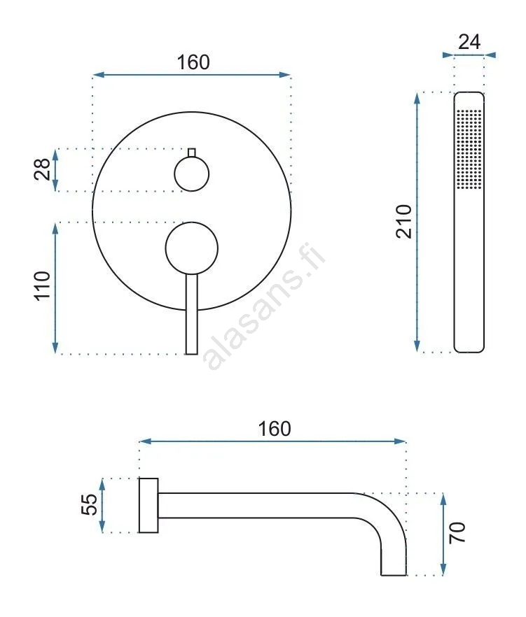 • Setti sisältää: ammehana, seinään asennettava juoksuputki, käsisuihku, suihkuletku (160 mm), käsisuihkun pidike.