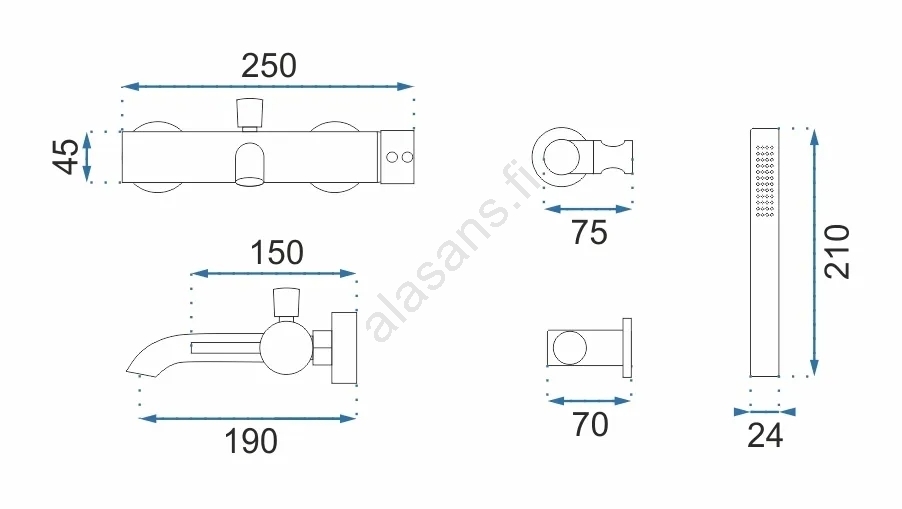 • Sarja sisältää: ammehanan, käsisuihkun, suihkuletkun (190 mm), käsisuihkun pidikkeen.