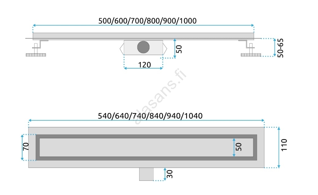 • 70 cm pitkä lineaarinen lattiakaivo ruostumattoman teräksen sävyssä.