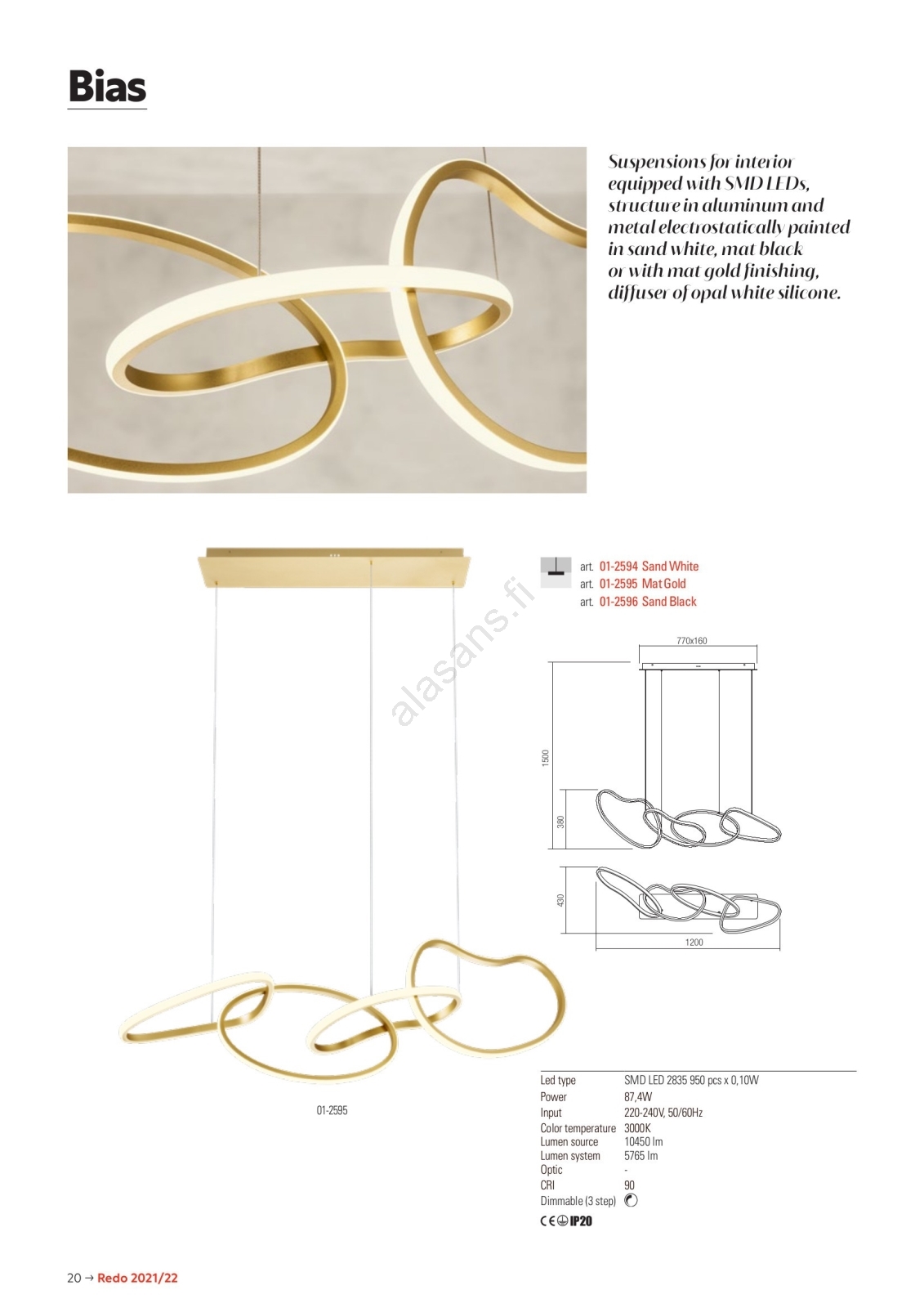 • Redo 01-2597 - Himennettävä riippuvalaisin vaijerilla BIAS LED/108,6W/230V 3000K CRI 90 valkoinen