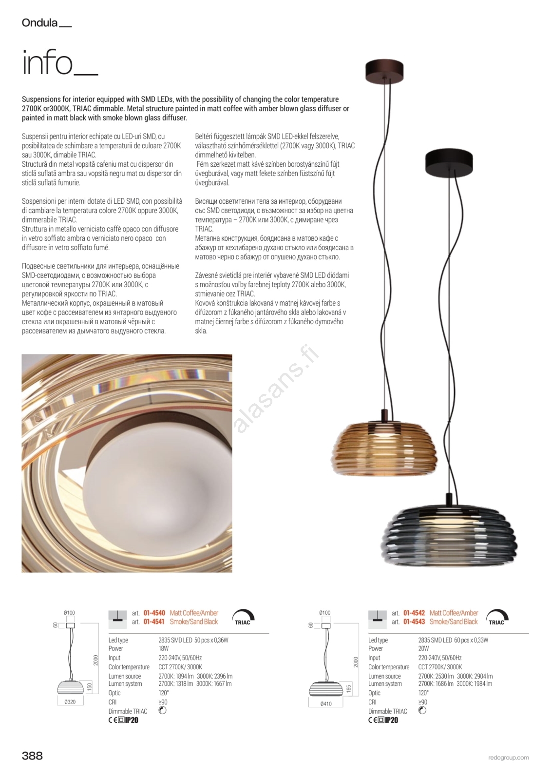 • Redo 01-4542 - ONDULA LED himmennettävä riippuvalaisin vaijerilla, 16 W, 230 V, 2700–3000 K, CRI 90, Ø 41 cm, beige/savunharmaa