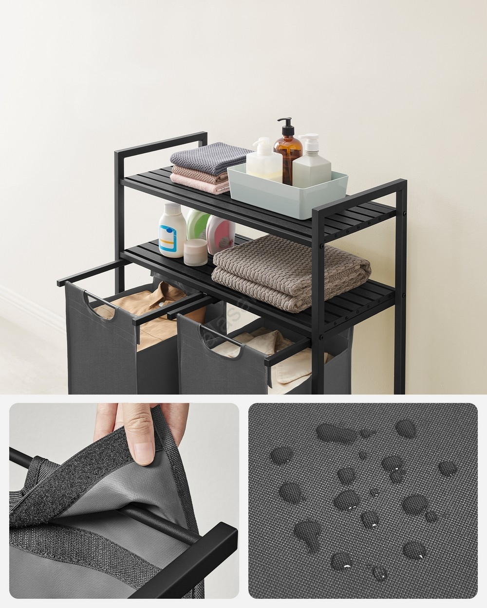 • 2 säkkiä, 2 hyllyä – Lajittele pyykit kahteen kangaspussiin (46 l per pussi) ja sijoita pesuaineet, huuhteluaine ja muut tarvikkeet niiden yläpuolella oleville hyllyille.