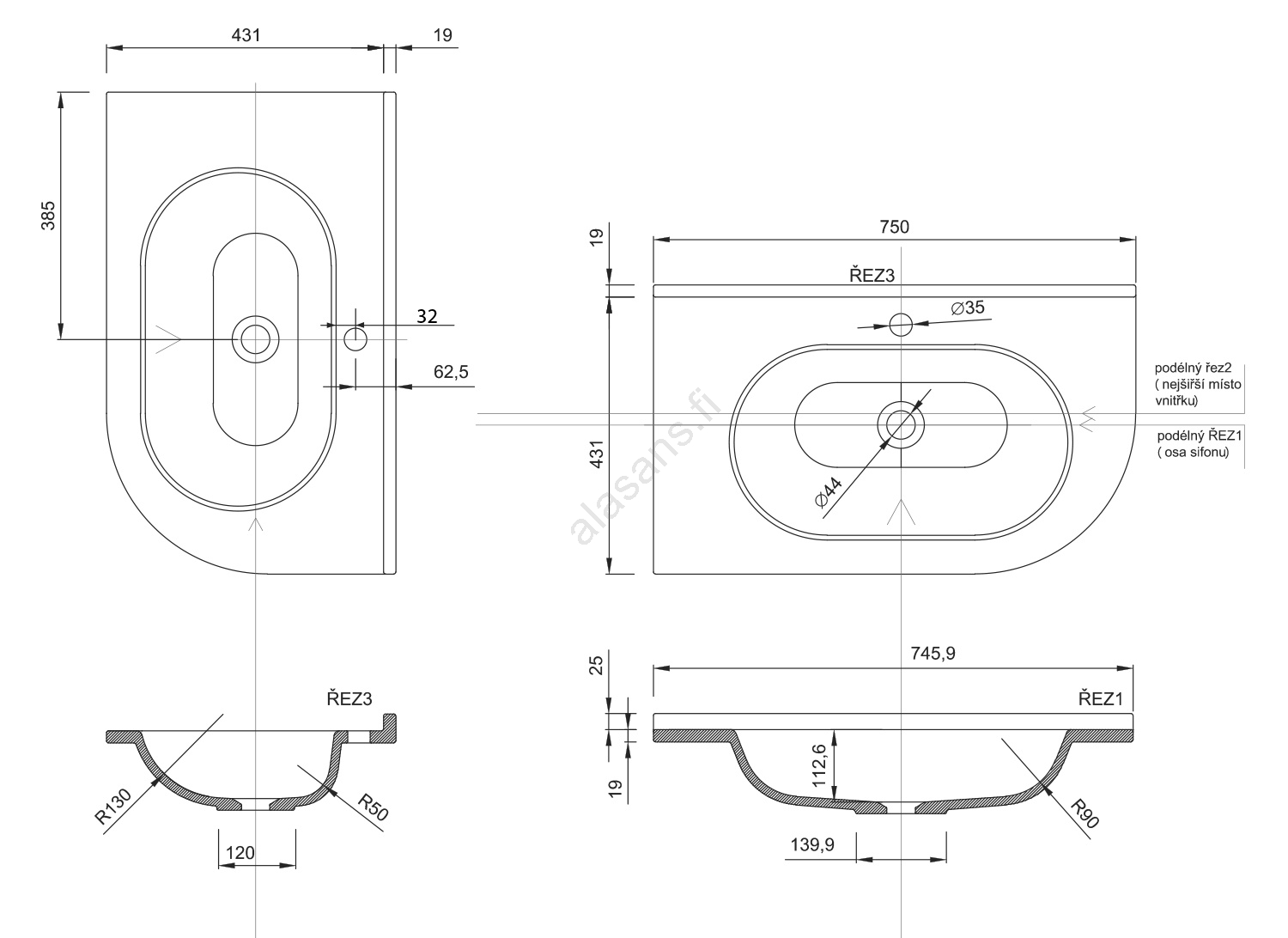 Sapho - Kulma-upotettava pesuallas PULSE 75x43 cm marmori/valkoinen | Alasans