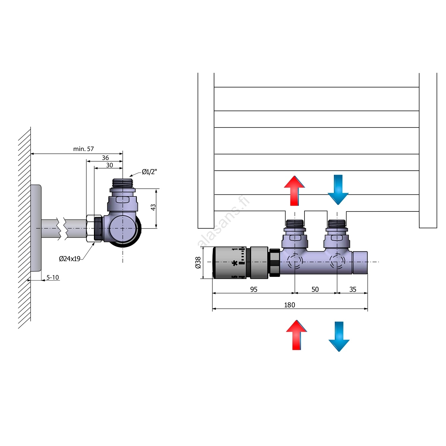 Sapho - Termostaattinen liitäntäsarja keskiliitäntään TWIN vasen/kiillotettu kromi | Alasans
