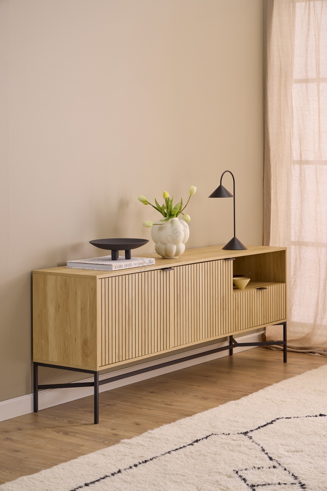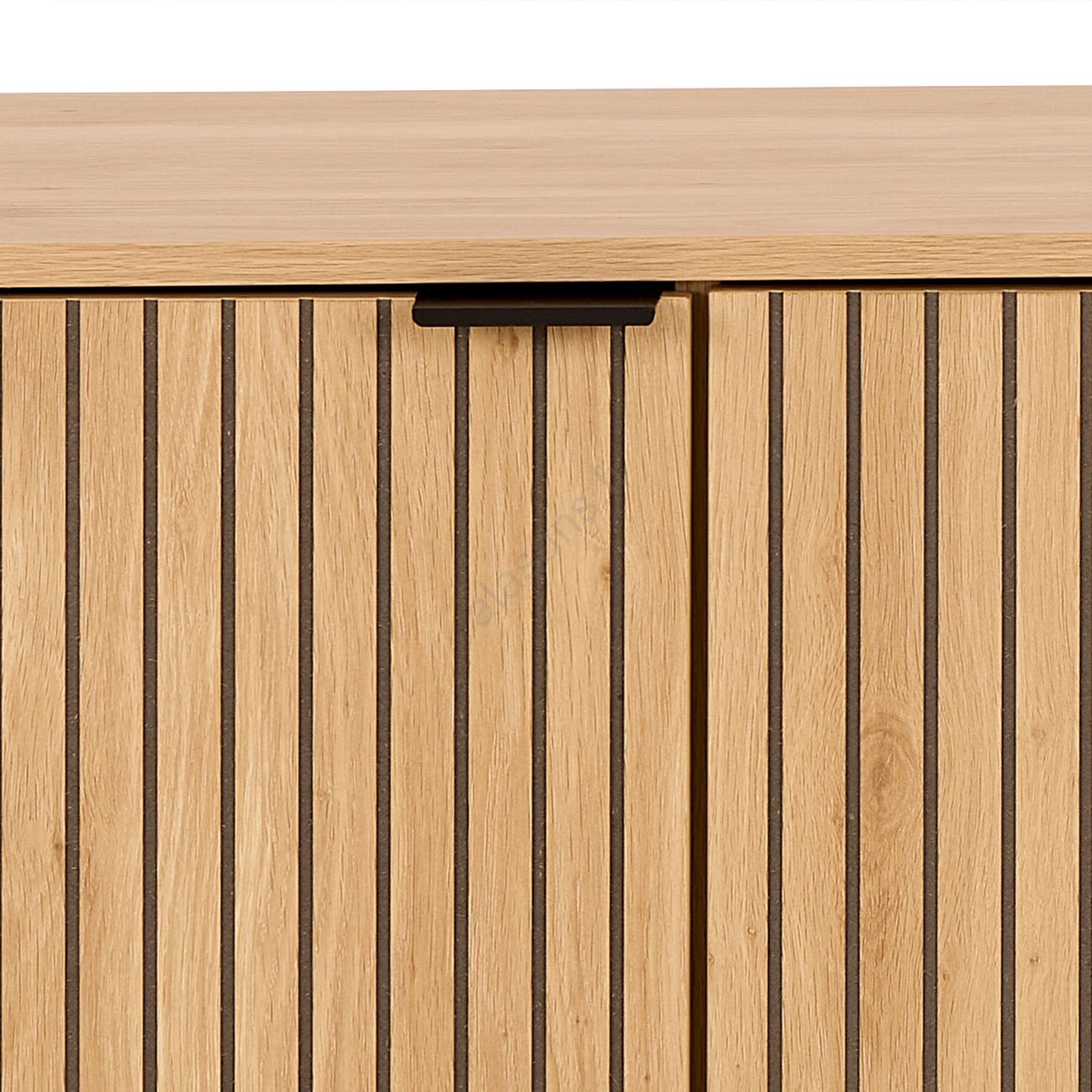 • Ylälevy, runko, 2 ovea, laatikko ja 2 hyllyä tammen karkeaa melamiinia, jalusta mattamustaa karkeasti jauhemaalattua terästä lamellipinnalla.
