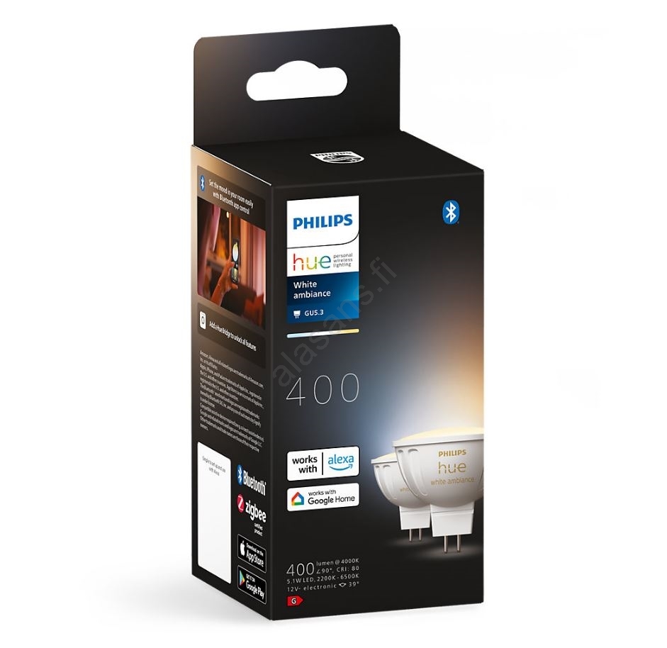 • Setti 2x LED White Ambiance himmennettävää GU5,3-kantaista lamppua.