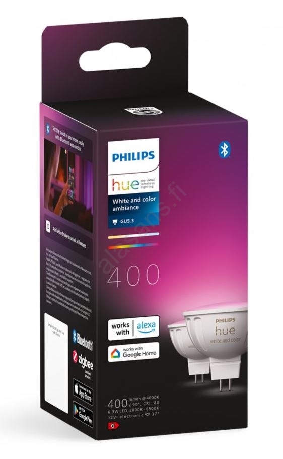 • 3 kpl LED White And Color Ambiance himmennettävää GU5,3-kantaisella lamppulla.