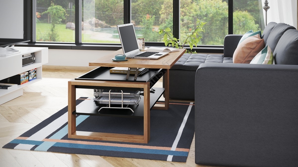 • Kokouspöytä nostettavalla kannella ja hyllyllä NEA tammi craft/musta